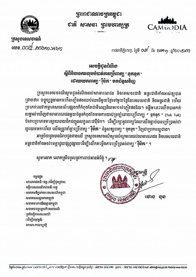 បើតាមសេចក្តីជូនដំណឹងរបស់ក្រសួងបានអោយដឹងថា ៖ ក្រសួងទេសចរណ៍សូមជូនដំណឹងដល់សាធារណជន និងទេសចរជាតិ អន្តរជាតិទាំងអស់អោយបានជ្រាប់ថា ៖ បច្ចុប្បន្នមានការកើនឡើងឥតឈប់ឈរពីមួយថ្ងៃទៅមួយថ្ងៃនៃទេសចរជាតិ និងអន្តរជាតិ ហើយប្រភេទសេវាកម្មទេសចរណ៍មួយចំនួនកំពុងមានការពេញនិយមសំរាប់ភ្ញៀវផងដែរ។ ទន្ទឹមនិងនេះយើងបានកត់សម្គាល់ឃើញថាសាធារណជនមួយចំនួនកំពុងមានការយល់ច្រឡំដោយប្រើពាក្យ “ទុកទុក” (Tuk Tuk) ចំពោះមធ្យោបាយដឹកជញ្ជូនជាលក្ខណះរ៉ឺម៉ក។ ដើម្បីរក្សានូវពាក្យដែលយើងធ្លាប់ប្រើប្រាស់ជាយូរយារមកហើយ យើងត្រូវនាំគ្នាប្រើពាក្យ “រ៉ឺម៉ក” ជំនួសពាក្យ “ទុកទុក” វិញជាប្រការល្អជាង។