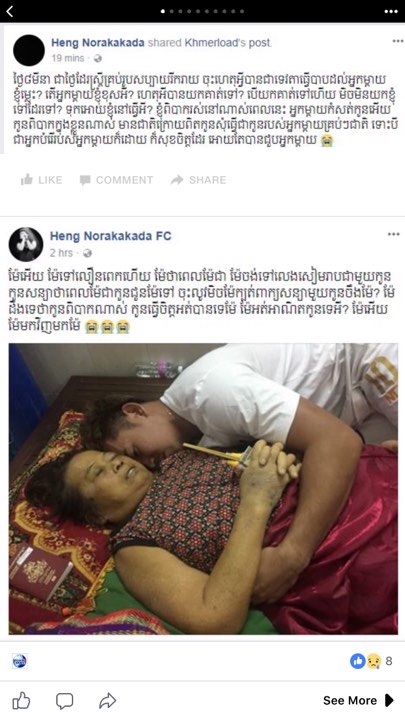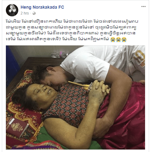 ដោយផ្អែកលើពត៍មាននេះ ក្នុងគណនីហ្វេសប៊ុករបស់គាត់ផ្ទាល់បានបង្ហោះរូបម្តាយរបស់គាត់អមជាមួយខ្លឹមសារដូចតទៅ៖ ( ម៉ែអេីយ ម៉ែទៅលឿនពេកហេីយ ម៉ែថាពេលម៉ែជា ម៉ែចង់ទៅលេងសៀមរាបជាមួយកូន កូនសន្យាថាពេលម៉ែជាកូនជូនម៉ែទៅ ចុះឥលូវម៉េចម៉ែក្បត់ពាក្យសន្យាជាមួយកូនចឹងម៉ែ? ម៉ែដឹងទេថាកូនពិបាកណាស់ កូនធ្វេីចិត្តអត់បានទេម៉ែ ម៉ែអត់អាណិតកូនទេអី? ម៉ែអេីយ ម៉ែមកវិញមកម៉ែ ) ៕