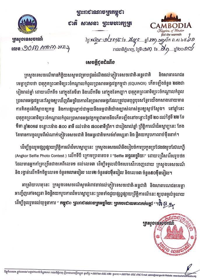 ក្រសួងបានអំពាវនាវដល់ភ្ញៀវទេសចរជាតិ អន្តរជាតិ និងសាធារណជន ទស្សនា និងផ្តិតយករូបភាពក៏មហស្ចារ្យនេះ ព្រមទាំងជួយផ្សព្វផ្សាយព្រឹត្តិការណ៍នេះ ឲ្យបានទូលំទូលាយដើម្បីចូលរួមដល់យុទ្ធនាការ “កម្ពុជា ៖ ព្រះរាជាណាចក្រអច្ឆរិយៈ ប្រកបដោយភាគកក់ក្តៅ”៕