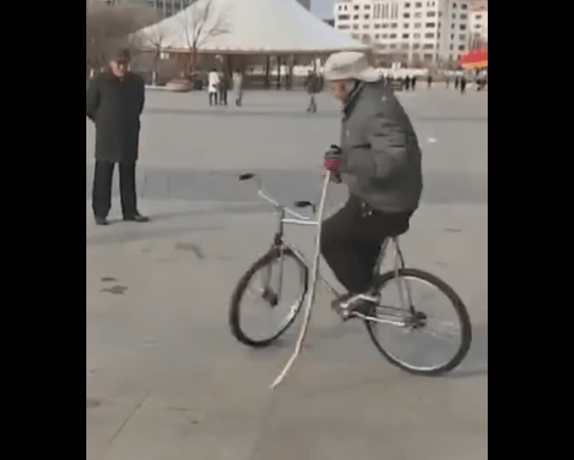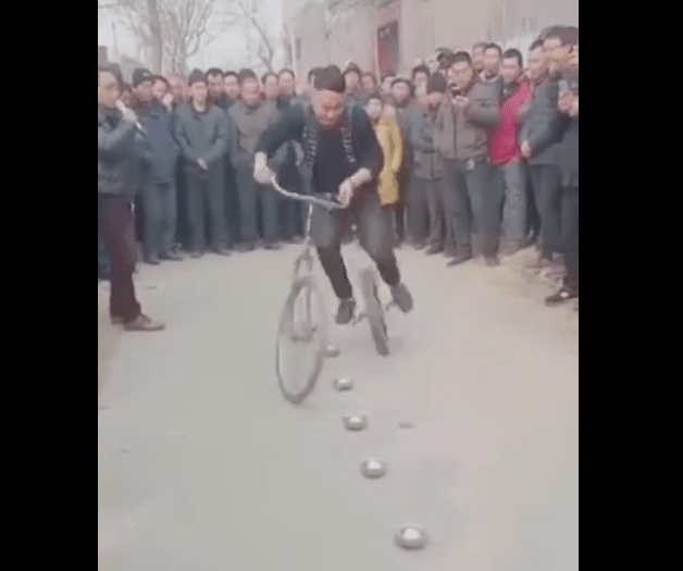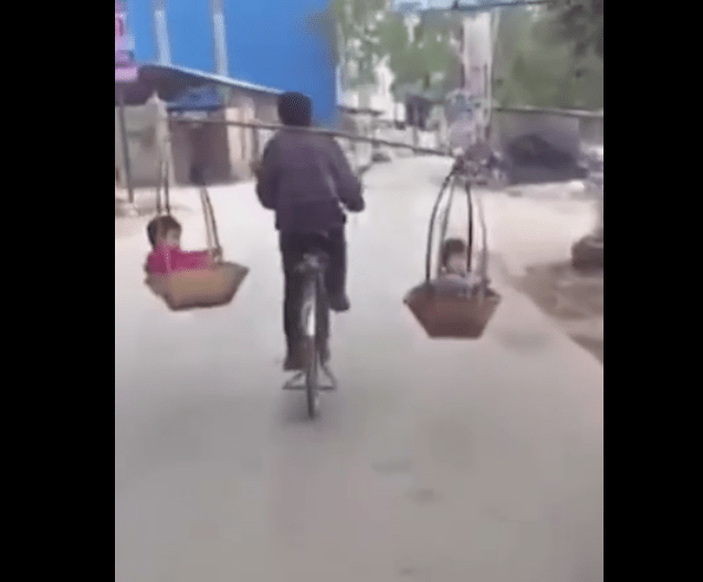 ១០-ជីះកង់ហើយរែកកូនទាំងពីនៅលើស្មាដោយមិនប្រើដៃកាន់ព្រោះដៃរវល់កាត់ចង្កូតកង់ហើយ