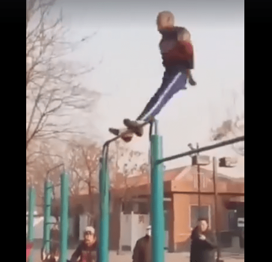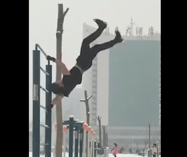 ៦-ដើរលើខ្យល់ ដោយប្រើដៃទាំងពីរតោងដើមឈើសំរាប់ទ្រទំងន់ខ្លួន