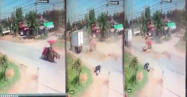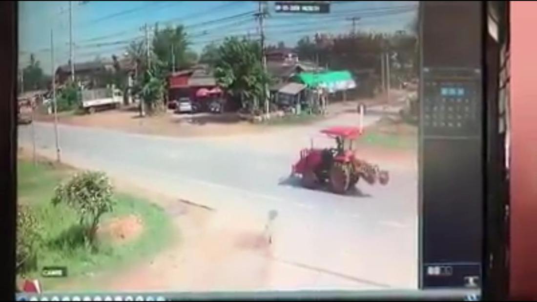 នៅក្នុងវិដេអូនេះដែរ យើងឃើញមានត្រាក់ទ័រមួយបម្រុងនឹងបត់ស្តាំ ស្រាប់តែមានរថយន្តដឹកទំនិញធនធំមួយគ្រឿងបានបុកពីក្រោយ បណ្តាលឲ្យត្រាក់ទ័រនោះខ្ទិចខ្ទីស្ទើតែទាំងស្រុង មិនតែប៉ុណ្ណុោះស្រាប់តែមានខ្ទាតបំណែងរបស់ត្រាក់ទ័រមកត្រូវនឹងម៉ូតូបណ្តាលឲ្យដួលថែមទៀតផង ។