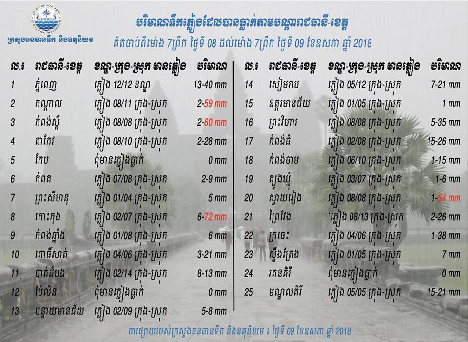 កម្រិតបរិមាណទឹកភ្លៀងដែលបានធ្លាក់តាមបណ្តារាជធានី-ខេត្ត (គិតចាប់ពីម៉ោង ៧ព្រឹកថ្ងៃទី ០៨ ដល់ម៉ោង ៧ព្រឹក ថ្ងៃទី ០៩ ខែឧសភា ឆ្នាំ ២០១៨)