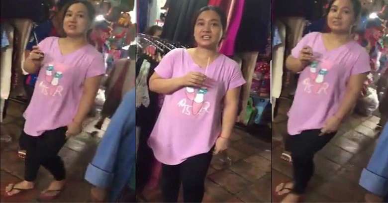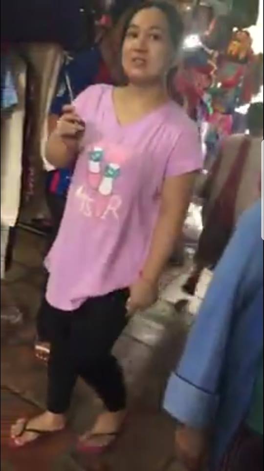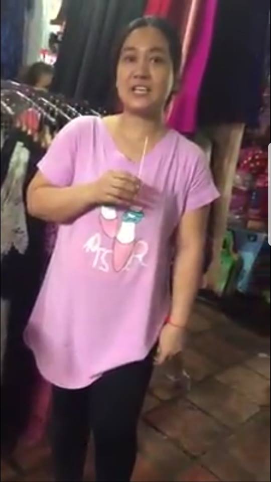 បើយើងក្នុងវីដេអូឃ្លីបនេះ ដែលគេបានចែកចាយលើបណ្តាសង្គមហ្វេសប៊ុស គេឃើញថាស្រ្តីជាអ្នកលក់ពាក់អាវពណ៌ផ្កាឈូកបានតាមសួរថា ”អូនឯងសួរតម្លៃការបូបបងហើយត្រូវតែតថ្លៃ”។