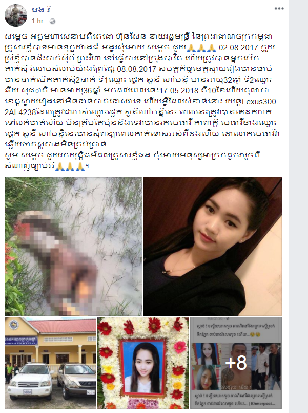មហាជនពិតជាបានដឹងរួចមកហើយ ករណីរំលោភសំលាប់យ៉ាងសាហាវ ក្នុងពេលកន្លងទៅ ពេលនេះជនរងគ្រោះនៅមិនទាន់ទទួលបានយុត្តិធម៍នៅឡើងទេ។ ខាងក្រោមនេះជាសំដីផ្ទាល់របស់សាច់ញាតិជនរងគ្រោះដែលអង្វរករ អោយសម្តេចអគ្គមហាសេនាបតីតេជោ ហ៊ុន សែន មេត្តាជួយរកយុត្តិធម៍អោយពួកគាត់ផង។ តាមសំណេររបស់គាត់ក្នុងបណ្តាញសង្គមបានអោយដឹងថា ៖ សម្ដេច អគ្គមហាសេនាបតីតេជេា ហ៊ុនសែន នាយរដ្ឋមន្ដ្រី នៃព្រះរាជាណចក្រកម្ពជា គ្រួសារខ្ញុំបាទមានទុក្ខយ៉ាងធំ អង្វរសុំអេាយ សម្ដេច ជួយ