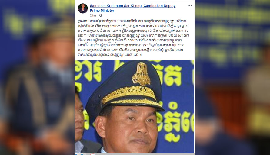 (ភ្នំពេញ) យោងតាមទំព័រហ្វេសប៊ុករបស់សម្ដេចក្រឡាហោម ស ខេង នៅថ្ងៃទី១២ ខែកញ្ញានេះ បានឲ្យដឹងថា មានអ្នកសារព័ត៌មានជាច្រើន បានចេញផ្សាយអំពីការផ្ទេរតំណែង និងការប្រគល់ភារកិច្ចជាស្នងការនគរបាលរាជធានីភ្នំពេញ ជូនលោកផ្កាយ៣ ស ថេត។