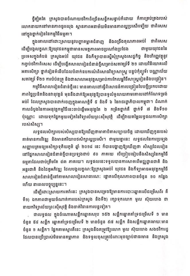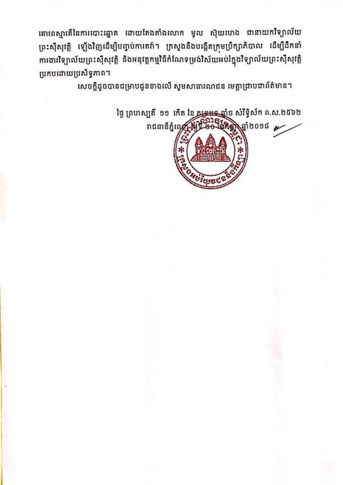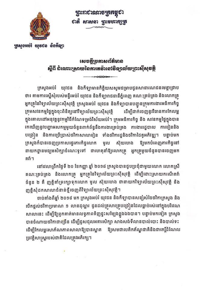 បញ្ហាវិទ្យាល័យព្រះស៊ីសុវត្ថិត្រូវបានបញ្ចប់ ស្រាប់តែធ្លាយរឿងក្រសួងធ្លាប់ផ្តល់ថវិការប្រមាណ ១លានដុល្លារអោយសាលានេះ ប៉ុន្តែដោយសារតែការគ្រប់គ្រងរដ្ឋបាលរបស់លោកនាយកសាលា មូល ស៊ុយហេង ទើបក្រសួងដកនាយកសាលារូបនេះមកបំរើការងារនៅ នាយកដ្ឋានមធ្យមសិក្សាចំណេះទូទៅ ដែលធ្វើអោយអ្នកគ្រូលោកគ្រូនៃវិទ្យាល័យព្រះស៊ីសុវត្ថិ ធ្វើការតវ៉ាចំពោះចំណាត់ការរបស់ក្រសួង។
