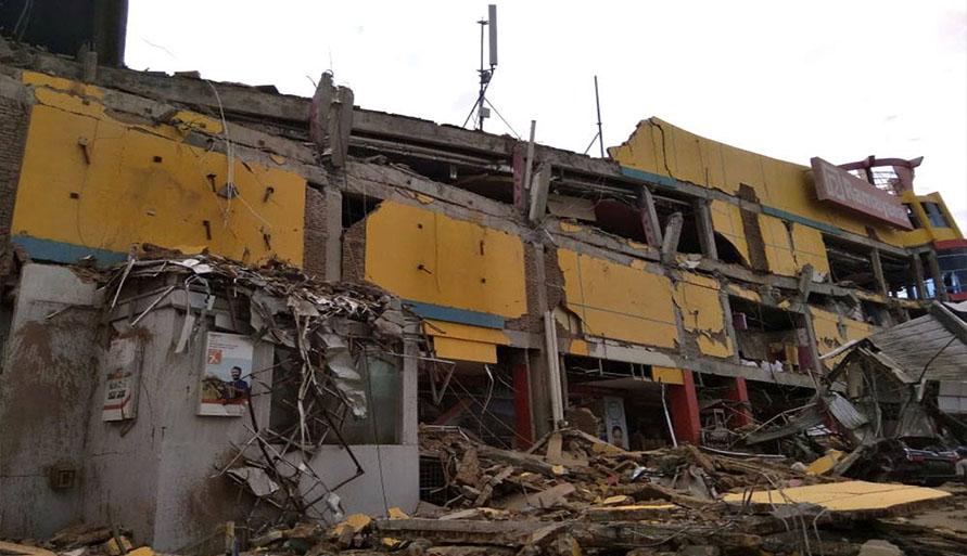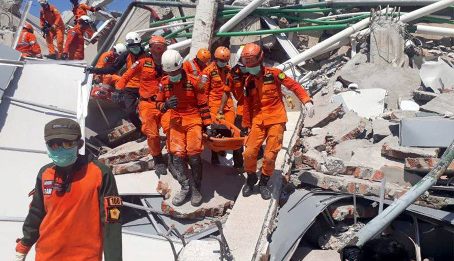 មនុស្សរាប់សិបនាក់ ត្រូវបានរាយការណ៍ថា នៅតែជាប់នៅក្នុងគំនរបាក់បែក នៃសណ្ឋាគារមួយ នៅទីក្រុង Palu ដែលត្រូវបានវាយប្រហារ ដោយរលកដែលមានកំពស់ 6 ម៉ែត្រ (20 ហ្វីត) បន្ទាប់ពីមានរញ្ជួយដី 7,5 រិចទ័រ។