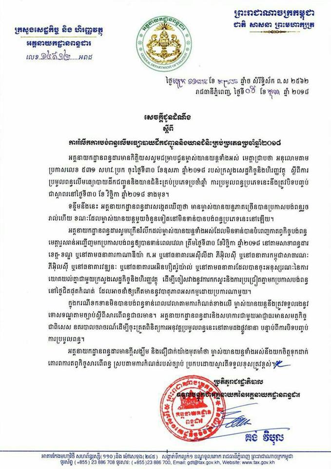 សេចក្តីជូនដំណឹងនេះបានអះអាងថា អនុលោមតាមប្រកាសលេខ៥៣១ សហវ.ប្រក ចុះថ្ងៃទី៣០ ខែឧសភា ឆ្នាំ២០១៨ របស់ក្រសួងសេដ្ឋកិច្ច និងហិរញ្ញវត្ថុ ស្តីពីការប្រមូលពន្ធលើលើមធ្យោបាយដឹកជញ្ជូន និងយានជំនិះគ្រប់ប្រភេទប្រចាំឆ្នាំ ការប្រមូលពន្ធនេះនឹងត្រូវបិទបញ្ចប់ត្រឹមថ្ងៃទី៣០ ខែវិច្ឆិកា ឆ្នាំ២០១៨ ខាងមុខ។