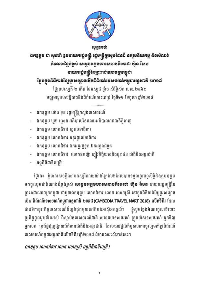(ភ្នំពេញ) ព្រឹត្តិការណ៍ពិព័រណ៍ទេសចរណ៍អន្តរជាតិកម្ពុជា ឆ្នាំ២០១៨ បានប្រារពជាផ្លូវការ នៅសាលពិព័រណ៍កោះពេជ្រ  នាថ្ងៃទី១១ ខែតុលានេះ ក្រោមវត្តមាន ឯកឧត្តម ជា សុផារ៉ា ឧបនាយករដ្ឋ  មន្ត្រី រដ្ឋមន្ត្រីក្រសួងដែនដីនគរូបនីយកម្ម និងសំណង់់ និងជាតំណាងដ៏ខ្ពង់ខ្ពស់  សម្តេចអគ្គមហាសេនាបតីតេជោ ហ៊ុន សែន នាយករដ្ឋមន្ត្រី មានក្រុមហ៊ុនចូលរួមតាំងពិព័រណ៍ចំនួន៥០០ក្រុមហ៊ុន មានស្តង់១៧៣ស្តង់ មកពី៨០ប្រទេសជុំវិញពិភពលោក និង មានស្ថាប័នទេសចរណ៍ជាតិ មកពីតំបន់អាស៊ាន អាស៊ាន+៣ និងតំបន់អាស៊ីប៉ាស៊ីហ្វិកចូលរួមយ៉ាងច្រើនកុះករ។