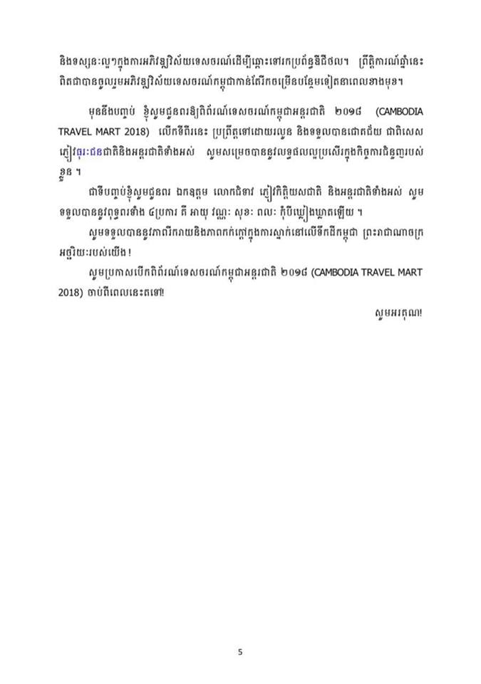 ឯកឧត្តម ថោង ខុន បញ្ជាក់ថា ព្រឹត្តិការណ៍នេះ បង្ហាញថា កម្ពុជាពិតជាគោលដៅទេសចរណ៍ដ៏ទាក់ទាញ ក្នុងតំបន់ និងក្រៅពីការទស្សនាលំហែកម្សាន្ដ អាចជាគោលដៅសម្រាប់ទទួលរៀបចំព្រឹត្តិការណ៍ទេសចរណ៍ធំៗកំរិតអន្តរជាតិដូចជា MICE Event ជាក់ស្ដែងដូចជាព្រឹត្តិការណ៍ពិព័រណ៍ CTM នាពេលនេះ។ គោលដៅទេសចរណ៍កម្ពុជា ក្នុងរយៈប៉ុន្មានឆ្នាំចុងក្រោយនេះ មានការរីកចំរើនគួរជាទីមោទនៈ។ ឆ្នាំ២០១៧ កម្ពុជាទទួលបានភ្ញៀវទេសចរអន្តរជាតិចំនួន៥,៦លាននាក់ កើន១១,៨%ដែលបាននាំមកចំណូលដោយផ្ទាល់៣,៦ពាន់លានដុល្លាអាមេរិក ចាក់បញ្ចូលទៅក្នុងកំណើនសេដ្ឋកិច្ចជាតិ ប្រមាណ១៣% នៃ ផលិតផលសរុបក្នុងស្រុក បង្កើតការងារដោយផ្ទាល់ចំនួន៦២ម៉ឺននាក់ និងបង្កើតការងារដោយប្រយោលរាប់សិបម៉ឺននាក់បន្ថែមទៀត។