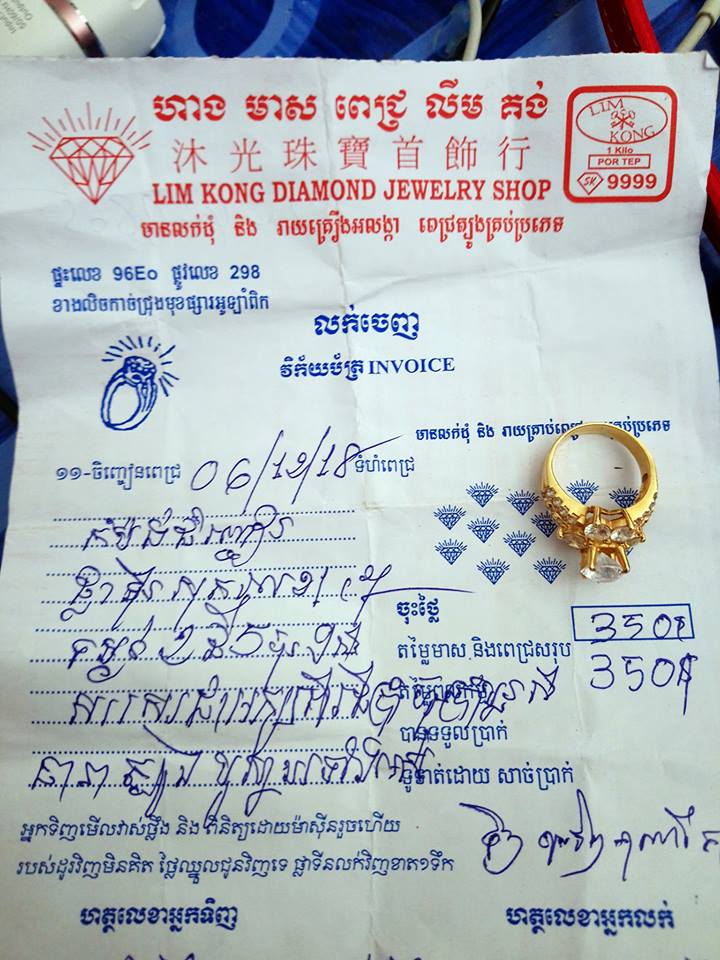 «នេះហើយលទ្ធផល ទៅទិញចិញ្ចៀនមិនបានពិនិត្យវិក្កយប័ត្រច្បាស់លាស់ មកជួបបញ្ហាយ៉ាងធ្ងន់ធ្ងរ ត្រូវម្ចាស់ហាងបោកប្រាស់ ហើយខ្ញុំសូមផ្ដាំផ្ញើទៅដល់ម្ចាស់ហាង ថាល្មមឈប់ទៅអាទង្វើបោកប្រាស់គេនឹង ចិញ្ចៀនផ្លាទីនទឹក7ទំនង់2ជី6ហ៊ុនតម្លៃ350$ យកមកពាក់បាន10ថ្ងៃ ដល់ពេលមកមើលវិក្កយប័ត្រ ក៏ភ្ញាក់ខ្លួនព្រើត ខ្ញុំក៏ប្រញាប់យកទៅលក់វិញ មានណាបងប្អូនអើយ ចិញ្ចៀនតម្លៃ350$ពាក់បាន10ថ្ងៃយកទៅលក់បាន180$ និយាយលែងចេញតែម្ដងបងប្អូន នឹកស្មានមិនដល់។ ជាចុងក្រោយសុំផ្ដាំទៅម្ចាស់ហាង មាស ពេជ្រ លីម គង់ ផងថាឈប់បានឈប់ទៅហើយសូមបងប្អូនជួយ Like ជួយ Share អោយទៅដល់ម្ចាស់ហាង ផង »។