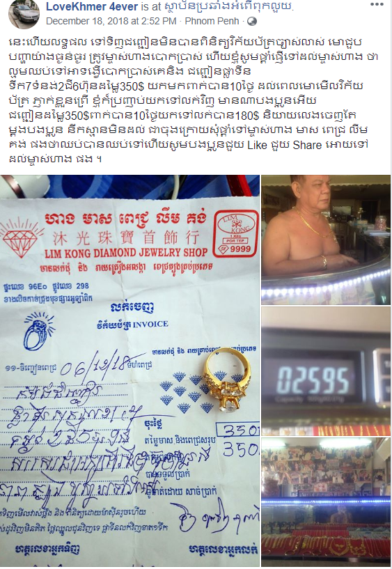 វាពិតជារឿងមួយដែលគួរឲ្យភ្ញាក់ផ្អើលខ្លាំងណាស់ បន្ទាប់ពីទៅទិញចិញ្ចៀនផ្លាទីនតម្លៃ ៣៥០ដុល្លារ ពីហាង មាស ពេជ្រ លីម គង់ ហើយពាក់បាន១០ថ្ងៃ លក់វិញបាន ១៨០ដុល្លារ ធ្វើឲ្យអ្នកទិញរូបនេះមិនអស់ចិត្ត យល់ថាត្រូវម្ចាស់ហាងបោកប្រាស់ ក៏បានបង្ហោះវិក្កយបត្រ ឈ្មោះហាង និងមុខមាត់ម្ចាស់ហាងលើហ្វេសប៊ុក និងរាប់រាប់យ៉ាងដូច្នេះថា៖