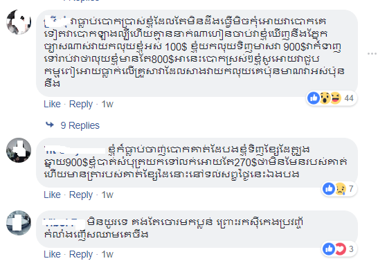 អាខោនមួយ(សុំមិនបញ្ចេញឈ្មោះ) បានខមិនថា ៖ វាធ្លាប់បោកប្រាស់ខ្ញុំដែលតែមិនដឹងធ្វើមិចកុំអោយវាបោកគេទៀតវាបោកឡាងល្បីហើយគ្មាននាក់ណាហៀនចាប់វាខ្ញុំឃើញនឹងភ្នែកច្បាសណាស់វាយកលុយខ្ញុំអស់ 100$ ខ្ញុំយកលុយទិញមាសវា 900$វាក៏ទាញទៅរាប់វាថាលុយខ្ញុំមានតែ800$អានេះបោកស្រស់ៗខ្ញុំសូអោយវាជួបកម្មពៀអោយធ្លាក់លើគ្រួសាវាដែលសាងវាយកលុយគេប៉ុនមាណវាអស់ប៉ុននឹង។