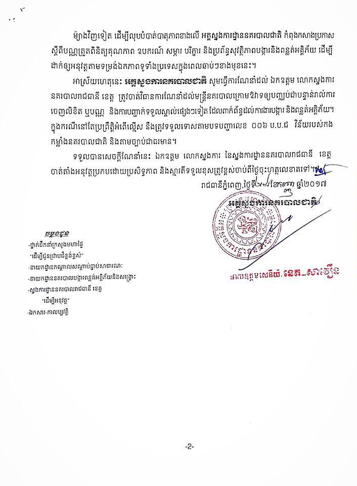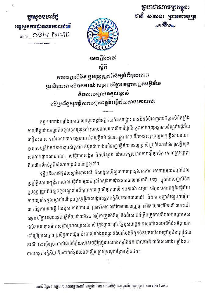 អគ្គស្នងការនគរបាលជាតិ បានចេញសេចក្ដីណែនាំ មិនអនុញ្ញាតឲ្យមន្ត្រីនគរបាលអគ្គិភ័យអាជីព ដើរលក់បំពង់ពន្លត់អគ្គិភ័យ ចុះតាមខ្នងផ្ទះប្រជាពលរដ្ឋ តាមមូលដ្ឋាន គ្រប់រាជធានី-ខេត្ត ឬទាមទារកម្រៃសេវាផ្សេងៗ ពីប្រជាពលរដ្ឋតាមខ្នងផ្ទះនោះឡើយ។