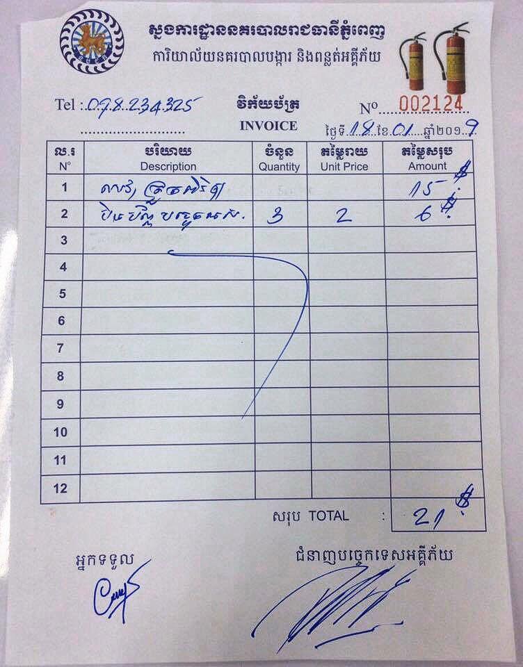 យោងតាមទំព័រហ្វសប៊ុកផ្លូវការ (Facebook Page) របស់នាយកដ្ឋាននគរបាលបង្ការ ពន្លត់អគ្គីភ័យ និងសង្គ្រោះ អគ្គស្នងការនគរបាលជាតិ បានឲ្យដឹងកាលពីវេលាថ្ងៃត្រង់ថ្ងៃទី១៩ ខែមករា ឆ្នាំ២០១៩នេះថា សូមជម្រាបជូនសាធារណជនគ្រប់រាជធានី/ខេត្ត ឲ្យបានជ្រាបថា អគ្គស្នងការដ្ឋាននគរបាលជាតិ បានចេញសេចក្តីណែនាំលេខ (០១២ ស.ណ.ន) ដល់មន្តីនគរបាលអគ្គិភ័យអាជីព នូវការមិនអនុញ្ញាតឲ្យចុះតាមខ្នងផ្ទះប្រជាពលរដ្ឋ តាមមូលដ្ឋាន គ្រប់រាជធានី /ខេត្ត ដើរលក់បំពង់ពន្លត់អគ្គិភ័យ ឬទាមទារកម្រៃសេវាផ្សេងៗ ពីប្រជាពលរដ្ឋតាមខ្នងផ្ទះ (គ្មានច្បាប់ ឬលិខិតបទដ្ឋានគតិយុត្តិ ដែលតម្រូវលើថ្លៃសេវានោះទេ)។ឧទាហរណ៍ ៖ ថ្លៃប័ណ្ណ ឬតែម បិទលើបំពង់ពន្ល់អគ្គិភ័យ ដូចបានភ្ជាប់លើវិក័យបត្រ មិនត្រឹមត្រូវខាងក្រោមនេះ។