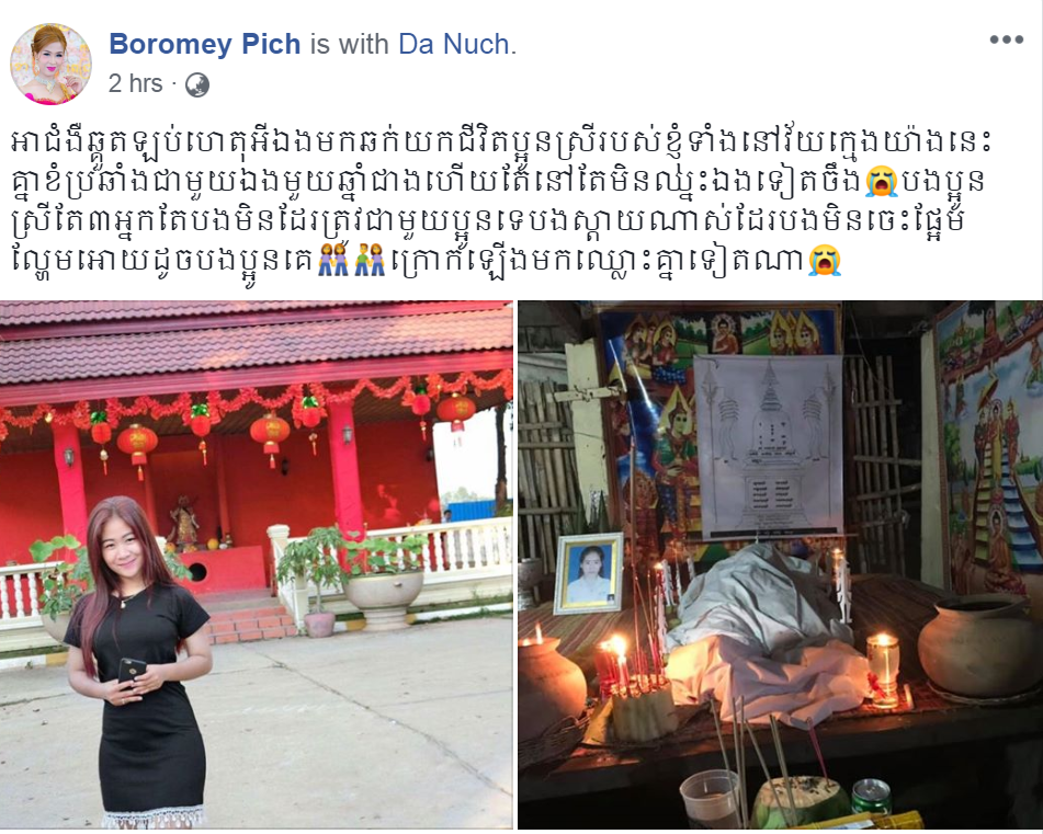កាលពីថ្មីៗនេះ មានករណី ជំងឺបាក់ទឹកចិត្ត ច្រើនអ្នកណាស់ យ៉ាងណាមិញ មុននេះបន្តិចគណនេយ្យហ្វេសបុកមួយឈ្មោះថាBoromey Pichបានបង្ហោះករណីនេះ ដែលបានកើតឡើងលើប្អូនស្រីរបស់គាត់ ដែលធ្វើឲ្យរូបនាងបញ្ចប់ជីវិតខ្លួនឯងទាំងនៅវ័យក្មេង បន្សល់ទុកនៅភាពក្រៀមក្រំ សោកសៅជាខ្លាំងក្នុងក្រុមគ្រួសារ។ តាមរយៈហ្វេសបុកខាងលើបានរៀបរាប់ដំណើររឿងយ៉ាងដូច្នេះថា៖ “អាជំងឺឆ្គួតឡប់ហេតុអីឯងមកឆក់យកជីវិតប្អូនស្រីរបស់ខ្ញុំទាំងនៅវ័យក្មេងយ៉ាងនេះ គ្នាខំប្រឆាំងជាមួយឯងមួយឆ្នាំជាងហេីយតែនៅតែមិនឈ្នះឯងទៀតចឹង😭បងប្អូនស្រីតែ៣អ្នកតែបងមិនដែរត្រូវជាមួយប្អូនទេបងស្តាយណាស់ដែរបងមិនចេះផ្អែមល្ហែមអោយដូចបងប្អូនគេ👭👫ក្រោកឡេីងមកឈ្លោះគ្នាទៀតណា😭” ទោះបីជាយ៉ាងណាក៌ដោយសូមណែនំាដល់អ្នកមានបញ្ហាក្នុងជីវិតទំាងអស់ត្រូវតែតស៊ូឡើង កុំគិតខ្លី ព្រោះដំនោះស្រាយនៅតែមានសំរាប់យើង