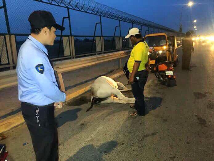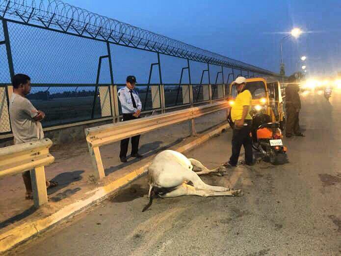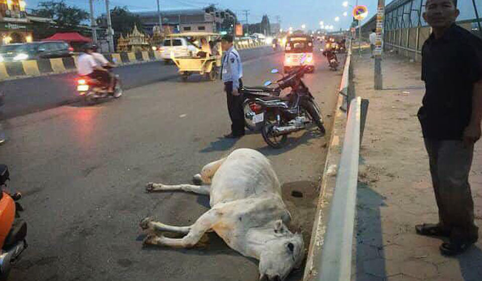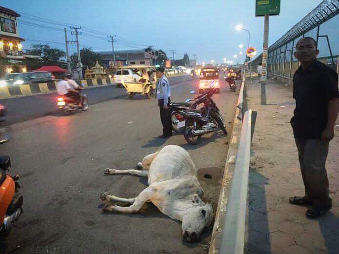 មេគោមួយក្បាល ម្ចាស់លែងអោយដេីរពាស់វាលពាស់កាលតាមផ្លូវសាធារណះត្រូវរថយន្តហាយឡែនឌ័រមួយគ្រឿងបើកបុក បណ្តាលឲ្យងាប់ កាលពីវេលាម៉ោង១និង៥០នាទីរំលងអធ្រាត្រ ចូលថ្ងៃទី២១ ខែមករា ឆ្នាំ២០១៩ ស្ថិតនៅតាមផ្លូវសហព័ន្ធរុស្សី ភូមិព្រៃជីសាក់ សង្កាត់ចោមចៅ៣ ខណ្ឌពោធិសែនជ័យ រថយន្តបន្តដំណើរទៅបាត់។