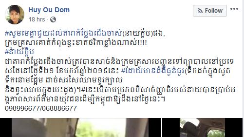ដែលនេះគឺជាការទទួលបានតាមរយៈគណនីហ្វេសបុកឈ្មោះ Huy Ou Dom បានរៀបរាប់ថា៖ «សូមមេត្តា ជួយដល់តារាកំប្លែង ជើងចាស់ (នាយក្ដឹប)ផង, ក្រុមគ្រួសារគាត់ កំពុងខ្វះខាតថវិកា ខ្លាំងណាស់!!!! នាយក្ដឹប ជាតារាកំប្លែងជើងចាស់ ត្រូវបានសាច់ និងក្រុមគ្រួសារបញ្ជូទៅព្យាបាលនៅប្រទេសថៃ