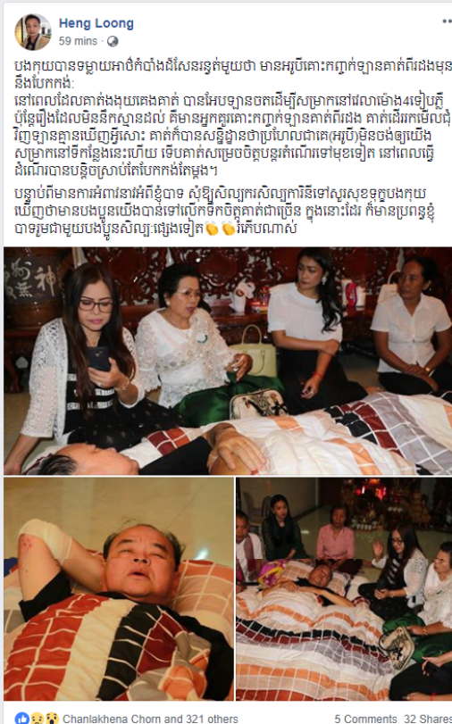 “បងកុយបានទម្លាយអាថ៌កំបាំងដ៏សែនរន្ធត់មួយថា មានអរូបីគោះកញ្ចក់ឡានគាត់ពីរដងមុននឹងបែកកង់។ នៅពេលដែលគាត់ងងុយគេងគាត់បានអែបឡានចតដើម្បីសម្រាកនៅវេលាម៉ោង4ទៀបភ្លឺ ប៉ុន្តែរឿងដែលមិននឹកស្មានដល់ គឺមានអ្នកគួរគោះកញ្ចក់ឡានគាត់ពីរដង គាត់ដើររកមើលជុំវិញឡានគ្មានឃើញអ្វីសោះ គាត់ក៏បានសន្និដ្ឋានថាប្រហែលជាគេ (អរូបី) មិនចង់ឲ្យយើងសម្រាកនៅទីកន្លែងនេះហើយ ទើបគាត់សម្រេចចិត្តបន្តរតំណើរទៅមុខទៀត នៅពេលធ្វើដំណើរបានបន្តិចស្រាប់តែបែកកង់តែម្ដង។បន្ទាប់ពីមានការអំពាវនាវអំពីខ្ញុំបាទ សុំឱ្យសិល្បករសិល្បការិនីទៅសួរសុខទុក្ខបងកុយ ឃើញថាមានបងប្អូនយើងបានទៅលើកទឹកចិត្តគាត់ជាច្រើន ក្នុងនោះដែរ ក៏មានប្រពន្ធខ្ញុំបាទរួមជាមួយបងប្អូនសិល្ប:ផ្សេងទៀត រំភេីបណាស់”។