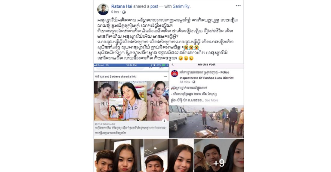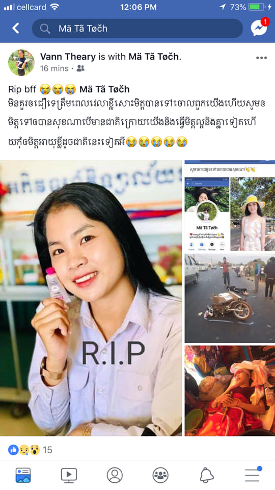 ថ្មីៗនេះបើយោងទៅតាមគណនីហ្វេសប៊ុកមួយដែលមានឈ្មោះថា Sarim Ry គាត់បានបង្ហោះសារនៅលើបណ្តាញសង្គមរបស់ខ្លួនបន្ទាប់ពីមនុស្សជាទីស្រឡាញ់របស់គាត់បានចាក់ចេញពីគាត់ដោយគ្នាមថ្ងៃត្រលប់ ដោយសារនាងបានជួបគ្រោះថ្នាក់ចរាចរណ៍ ហើយបានធ្វើឲ្យនាបានស្លាប់ភ្លាមៗនៅនិងកន្លែងកើតហេតុ តែម្តង ។ជាក់ស្តែងបុរសខាងលើគាត់បានបង្ហោះសារយ៉ាងដូច្នេះថា វាហាក់បីដូចជាលឿនពេកមែនបងស្ទើតែមិនជឿថាវាជាការពិតទេ😭តែបើអូនហត់ហើយអូនសម្រាកចុះណាអូនសម្លាញ់ព្រោះអូនហត់ពេកហើយ😭បងដឹងបងអត់បន្ទោសអូនទេ😭៕ អូនទៅអោយបានសុខកុំមានចិត្តអាលោះអាល័យអ្វីអោយសោះណាអូនសម្លាញ់💝៕ បើមានជាតិមុខសូមអោយអូនជួបតែរឿងល្អក្នុងជីវិតដូចអំពើល្អរបស់អូនណា🙏🙏🙏៕ បងពិតជាមានសំណាងណាស់ដែរបានស្គាល់អូន💝៕ អូនជាមនុស្សល្អបំផុតសម្រាប់បង💝៕ បងនឹងចងចាំការស្រលាញ់មួយនេះទុកក្នុងបេះដូងបងជានិច្ច💝៕