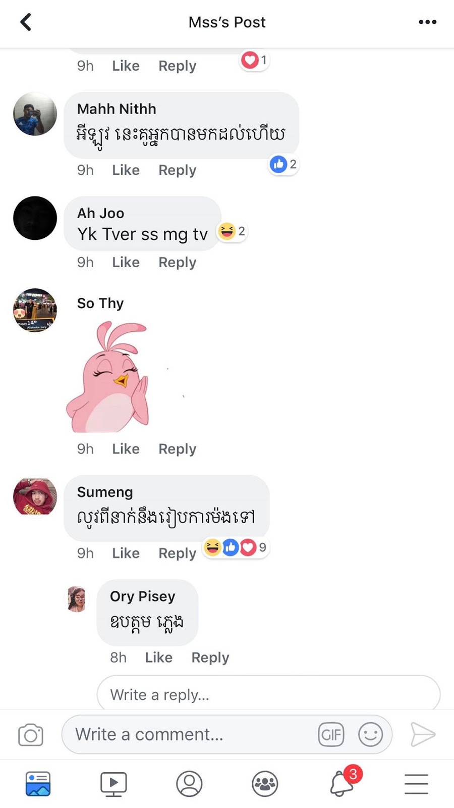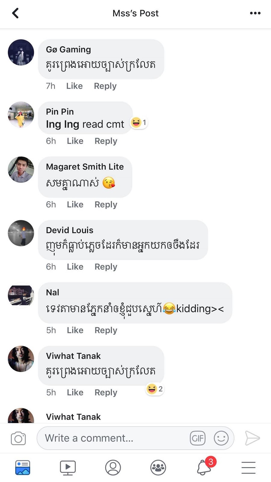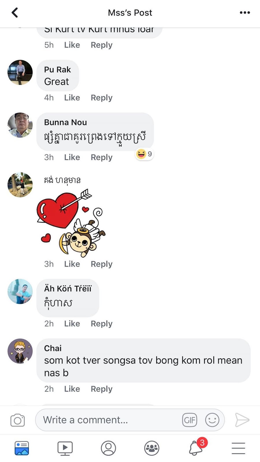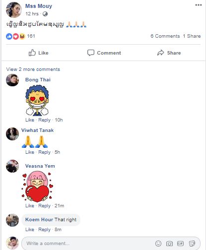 នារីខាងលើបានសរសេរលើ គេហទំព័រ ហ្វេស ប៊ុករបស់នាងកាលពីម្សិលមិញថា៖”គាត់ជាមនុស្សល្អ ខ្ញុំបានដាក់ទូរសព្ច័ក្នុងម៉ូតូហេីយដេីលផ្សារតែគាត់បានឃេីញហេីយគាត់យកអេាយខ្ញុំវិញ មិនងាយរកបានមនុស្សបែបនេះទេទូរសព្ច័ពីគ្រឿងតែគាត់យកអេាយខ្ញុំវិញអរគុណបងប្រុស គាត់ជាមនុស្សដែរកំររកបាន អរគុណបង កុំវាយតំលៃមនុស្សតែសំបកក្រៅ”។ដូចគ្នានេះ ដែលមហាជនជាច្រើន ក៏បាននាំគ្នា ឡាយ និងស៊ែរចែករំលែកតៗគ្នាជាច្រើន ថែមទាំងកោតសរសើរទឹកចិត្ដដ៏ល្អរបស់បុរសម្នាក់នោះ ហើយមានមហាជនមួយចំនួនទៀតបាននាំគ្នា បញ្ចេញមតិថា៖”រកគូព្រេងឃេីញហេីយចឹង។” , “ជូនលុយ ឬ ជូនបេះដូងស្មោះ ទៅទុកជាសាគុន។” , “គូរព្រេង អោយច្បាស់ក្រឡែក ឥលូវនេះ គូរព្រេងបានមកដល់ហើយ”។