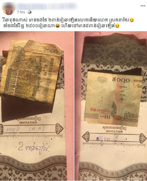 មានរឿងដ៏គួរឱ្យហួសចិត្តមួយ បានកើតឡើងកាលពីពេលថ្មីៗនេះ មានគណនីហ្វេសបុកមួយ ដែលមានឈ្មោះថា Weng.. បានបង្ហោះសារអះអាងថា ម្ចាស់ដើមការវិលមុខហើយ សម័យនេះហើយមានអ្នកចងដៃ ២ពាន់រៀល និង៥ពាន់រៀលទៀត ។គណនីហ្វេសប៊ុកដដែល បានបង្ហោះសារអមដោយរូបភាព នៅម៉ោង៨និង២៨នាទី ព្រឹកថ្ងៃទី២៩ មករា ២០១៩ នេះថា៖ «វិលមុខណាស់ មានចងដៃ ២ពាន់រៀលទៀត លោកអើយលោក ស្រុកតាកែវ ចាំចងដៃវិញ ២៥០០រៀលណា ហើយនៅមាន៥ពាន់រៀលទៀត» ។បើតាមគណនីឈ្មោះ Weng.. ទំនងជាសាមីខ្លួនផ្ទាល់(កូនកំលោះ) បានបញ្ជាក់អោយដឹងថា « សូមអរគុណចំពោះភ្ញៀវកិត្តិយស និងមិត្តសម្លាញ់ផងដែរ ដែលបានចូលរួមកម្មវិធីអាពាហ៍ពិពាហ៍របស់រូបខ្ញុំ ទាំងពីរនាក់(នៅខេត្តឧត្ដរមានជ័យ) ថ្ងៃទី២៧ ខែមករា ឆ្នាំ២០១៩ ហើយក៏សូមខន្តីអភ័យទោស ចំពោះការទទួលស្វាគមន៍មិនបានដិតដល់ ឬក៏មានការខ្វះខាតចំណុចណាមួយដោយអចេតនា ហើយម្យ៉ាងវិញទៀតក៏ មានមិត្តសម្លាញ់នៅរហូតដល់បរទេសឆ្លៀតចងដៃទៀត អរគុណ!» ។