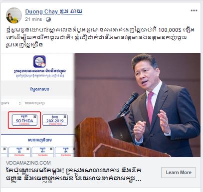 ប្រិយមិត្តជាច្រើនប្រាកដជាបានស្គាល់ហើយថា លោកឧកញ៉ាឌួង ឆាយ គឺជាមនុស្សដែលមានសន្តានចិត្តល្អ តែងតែជួយដល់អ្នកក្រីក្រ ធ្វើអំពើមនុស្សធម៌នៅក្នុងសង្គមជាច្រើន រហូតធ្វើឲ្យអ្នកលេងបណ្តាញសង្គម ជាច្រើនពេញចិត្ត និងស្រលាញ់ឧកញ៉ាគ្រប់គ្នា។ ហើយថ្មីៗនេះ លោកឧកញ៉ាឌួង ឆាយ បានបង្ហោះ ទាក់ទងទៅនឹងការជូនយោបល់មួយ ដោយលោក ឧកញ៉ាឌួង ឆាយបានសរសេរបណ្ហោះនៅលើបណ្តាញសង្គមថា ៉ ខ្ញុំសូមជូនយោបល់ស្លាកលេខដំបូងគួរមានការដាក់ដេញថ្លៃចាប់ពី 100,000$ ឡើងទៅដើម្បីយកថវិកាចូលជាតិ។ ខ្ញុំជឿជាក់ថានឹងមានវត្តមានឯឧត្តមឧកញ៉ាចូលរួមដេញថ្លៃច្រើន ៉