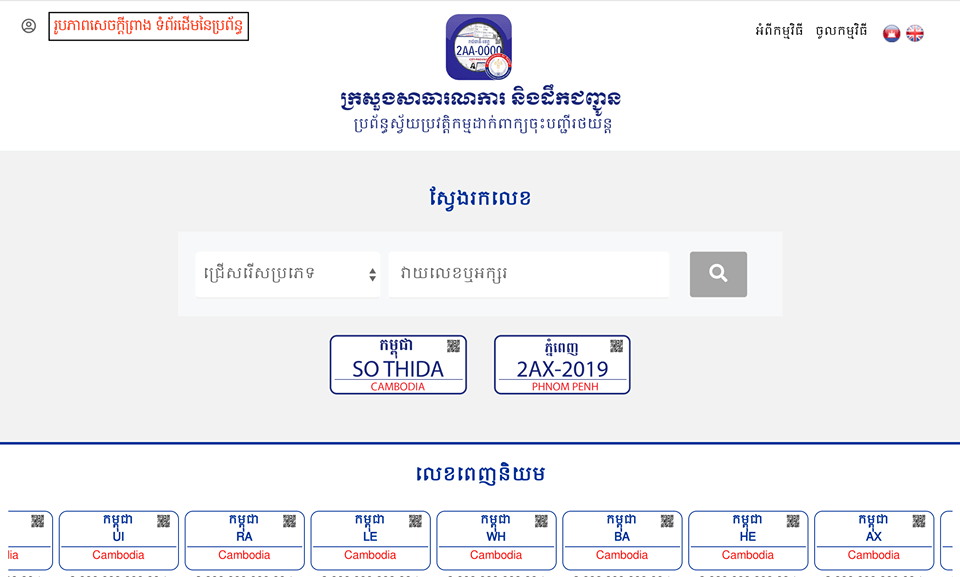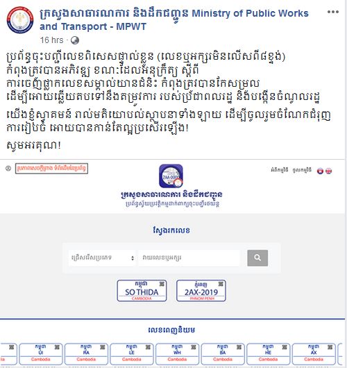 ដោយឡែក កាលពីម្សិលមិញនេះផងដែរ តាមរយៈគេហទំព័រផេក របស់ក្រសួង សាធារណការ និងដឹកជញ្ចូន បានបង្ហោះពីរបៀបចុះបញ្ជី ធ្វើផ្លាកលេខពិសេសផ្ទាល់ខ្លួន ដែលអាចប្រើប្រាស់ជាតួអក្សរ អង់គ្លេសជំនួសលេខបាន ដោយមិនអាចលើសពីចំនួន ៨តួអក្សរនោះឡើយ ដើម្បីតម្រូវការ និងបង្កើនប្រាក់ចំណូលរដ្ឋ។ក្នុងខ្លឹមសារនេះ ខាងក្រសួងបានសរសេរថា៖”ប្រព័ន្ធចុះបញ្ជីលេខពិសេសផ្ទាល់ខ្លួន (លេខឬអក្សរមិនលើសពី៨ខ្ទង់) កំពុងត្រូវបានអភិវឌ្ឍ ខណៈដែលអនុក្រឹត្យ ស្តីពី ការចេញផ្លាកលេខសម្គាល់យានជំនិះ កំពុងត្រូវបានកែសម្រួល ដើម្បីអោយឆ្លើយតបទៅនឹងតម្រូវការ របស់ប្រជាពលរដ្ឋ និងបង្កើនចំណូលរដ្ឋ យើងខ្ញុំស្វាគមន៍ រាល់មតិយោបល់ស្ថាបនាទាំងឡាយ ដើម្បីចូលរួមចំណែកជំរុញ ការរៀបចំ អោយបានកាន់តែល្អប្រសើរឡើង! សូមអរគុណ”៕