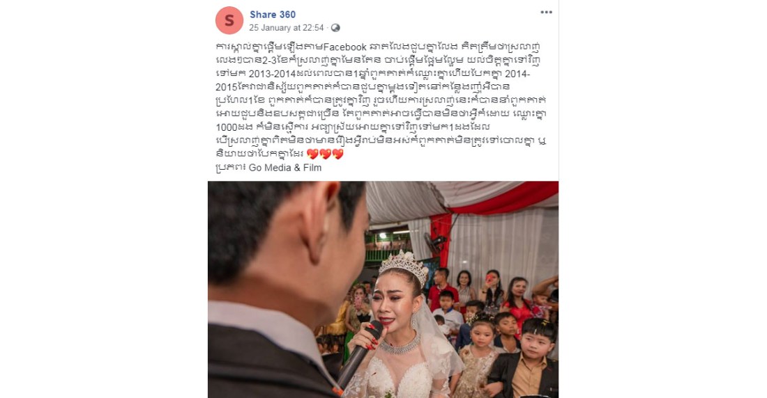 និស្ស័យធ្វើឲ្យមនុស្សពីរនាក់ បានស្គាល់ មានអ្នកខ្លះ ស្គាល់គាត់តាមរយៈ មិត្តភិក្ត អ្នកខ្លះក៏ស្គាល់គ្នាតាមទូរស័ព្ទ ហើយក៏មានអ្នកខ្លះទៀតស្គាល់គ្នាតាមហ្វេសប៊ុក។ យ៉ាងណាមិញនៅក្នុងគណនីហ្វេសប៊ុករបស់មួយដែល មានឈ្មោះថា Share 360 បានរៀបរាប់យ៉ាងដូច្នេះថា ៖ការស្គាល់គ្នាផ្ដេីមឡេីងតាមFacebook ឆាតលែងជួបគ្នាលែង គិតត្រឹមថាស្រលាញ់លេងៗបាន2-3ខែក៏ស្រលាញ់គ្នាមែនទែន ចាប់ផ្ដេីមផ្អែមល្ហែម យល់ចិត្តគ្នាទៅវិញទៅមក 2013-2014 ដល់ពេលបាន1ឆ្នាំពួកគាត់ក៏ឈ្លោះគ្នាហេីយបែកគ្នា 2014-2015 តែវាជានិស្ស័យពួកគាត់ក៏បានជួបគ្នាម្ដងទៀតនៅកន្លែងញ៉ាំអីបានប្រហែល1ខែ ពួកគាត់ក៏បានត្រូវគ្នាវិញ រួចហេីយការស្រលាញ់នេះក៏បាននាំពួកគាត់អោយជួបនិងឧបសគ្គជាច្រេីន តែពួកគាត់អាចធ្វេីបានមិនថាអ្វីក៏ដោយ ឈ្លោះគ្នា1000ដង ក៏មិនស្មេីការ អធ្យាស្រ័យអោយគ្នាទៅវិញទៅមក1ដងដែរ បេីស្រលាញ់គ្នាពិតមិនថាមានរឿងអ្វីរាប់មិនអស់ក៏ពួកគាត់មិនត្រូវទៅចោលគ្នា ឬនិយាយថាបែកគ្នាដែរ 💖💖💖”។