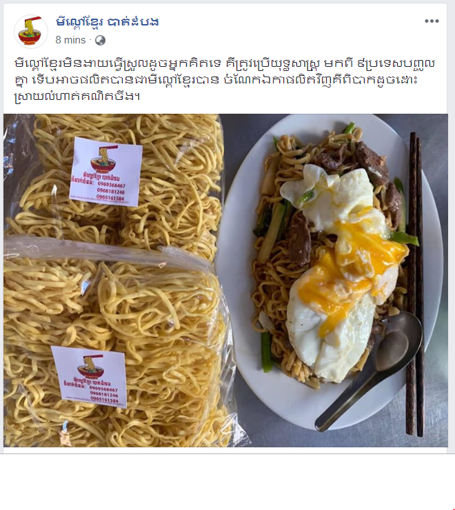 ប្រិយមិត្តពិតជាបានដឹងរួចហើយ កូនខ្មែរនៅបាត់ដំបង ម្នាក’សិក្សា​ស្រាវជ្រាវ​ទម្រាំ​បាន​ជា​ផលិត​ផល​មី​ធ្វើ​ពី​ផ្លែ​ល្ពៅ​នេះ ​យុវជន​ខាង​លើ​បាន​ចំណាយ​ពេល​ជិត​ ២​ឆ្នាំ​ទម្រាំ​បាន​ចេញ​ជា​សមិទ្ធផល​មីល្ពៅ ដែលពីផ្លែល្ពៅ សុទ្ធសាត ដោយឡែកព្រោះតែម៉ាស៊ីនតូចមិនគ្រប់គ្រាន់សំរាប់ទីផ្សារនោះ ដូចនេះសូមបងប្អូនមេត្តាអាធ្យាស្រ័យ យ៉ាងណាមិញកូនខ្មែររូបនេះនិងតស៊ូព្យាយាម រហូទទាល់តែគ្រប់គ្រាន់ទីផ្សារផងដែរ យ៉ាងណាមិញមុននេះបន្តិចមានកូនខ្មែរយើងម្នាក់ទៀតមកពីខេត្តត្បូងឃ្មុំ ស្រុក មេម៉ត់ បានធ្វើការស្រាវជ្រាវផលិតបានមីល្ពៅដែលហើយ ដោយមានតំលៃត្រឹមតែ ១មុឺន​រៀល ក្នុងមួយគីឡូ ដូចនេះសង្ឃឹមថាពុកម៉ែបងប្អូនជួយគំាទ្រផងដែល ។ យើងក្រលេកទៅមើលប្រភពហ្វេសប៊ុករបស់មីល្ពៅបាត់ដំបងផងដែរបានលើកឡើងដែលថា “មីល្ពៅខ្មែរគឺត្រូវបានទទួលស្គាល់ពីប្រជាជនខ្មែរទូទាំងប្រទេសហើយ។ បើជនណាម្នាក់ហានធ្វើមីល្ពៅលក់ ជននោះនឹងចាត់ទុកជា ចោរ។” មានមួយទៀតផងដែរ “មីល្ពៅខ្មែរមិនងាយធ្វើស្រួលដូចអ្នកគិតទេ គឺត្រូវប្រើយុទ្ធសាស្រ្ត មកពី ៩ប្រទេសបញ្ចូលគ្នា ទើបអាចផលិតបានជាមីល្ពៅខ្មែរបាន ចំណែកឯកាផលិតវិញគឺពិបាកដូចដោះស្រាយលំហាត់គណិតចឹង។”