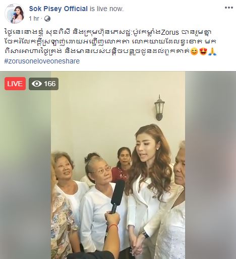 កាលពីម្សិលមិញនេះ កញ្ញា សុខ ពិសី ក៏បានបង្ហោះសារនៅលើគេហទំព័រ ហ្វេស ប៊ុកផេករបស់កញ្ញាផ្ទាល់ ដោយក្នុងខ្លឹមសារ នោះបានសរសេរថា៖”ស្អែកត្រូវជាថ្ងៃ14កុម្ភះ ទិវានៃក្តីស្រលាញ់ នាងខ្ញុំ សុខពិសីចង់អញ្ជើញលោកតា លោកយាយដែលខ្វះខាតមកពិសារអាហារថ្ងៃត្រង់មួយពេល និងមានរបស់បន្តិចបន្តួចជូនដល់ពួកគាត់ ដូចច្នេះបើប្អូនបាន ស្កាល់លោកតា លោកយាយដែលខ្វះខាត សូមទំនាក់ទំនង តាមលេខទូរសព្ទ័ 093 77 61 91 ខាងនាងខ្ញុំក៏មាន ឡានទៅទទួល លោកតា លោកយាយផងដែរ ទីតាំងសំរាប់ពិសារអាហារថ្ងៃត្រង់ ភោជនីយដ្ឋាន មាតុភូមិ សាខាជិតស្ថានីយ៍ ទូរទស្សន៍អាសុីអាគ្នេយ៍។”ទទឹមក្នុងថ្ងៃនេះផងដែរ ត្រូវជាទិវាបុណ្យនៃសេចក្ដីស្រលាញ់ ថ្ងៃទី១៤ ខែកុម្ភៈ ដោយក្នុងពេលនេះ តាមរយៈគេហទំព័រ ហ្វេស ប៊ុកផេករបស់កញ្ញា សុខ ពិសី ដដែលបានធ្វើការឡាយវីដេអូមុននេះបន្ដិច ដែលបង្ហាញពីទិដ្ឋភាពចែករំលែកក្ដីស្រលាញ់ ចំពោះមនុស្សចាស់ ក្នុងការជួបជុំ ពិសារអាហារជុំគ្នា។ជាមួយនឹងគ្នាដែរ កញ្ញា សុខ ពិសី ក៏បានសរសេរ នៅលើការឡាយវីដេអូនេះថា៖”ថ្ងៃនេះនាងខ្ញុំ សុខពិសី និងក្រុមហ៊ុនភេសជ្ជ:ប៉ូវកម្លាំង​Zorus បានរួមគ្នាចែករំលែកក្តីស្រឡាញ់ដោយអញ្ជើញលោកតា លោកយាយដែលខ្វះខាត មកពិសារអាហារថ្ងៃត្រង់ និងមានរបស់បន្តិចបន្តួចជូនដល់ពួកគាត់”៕