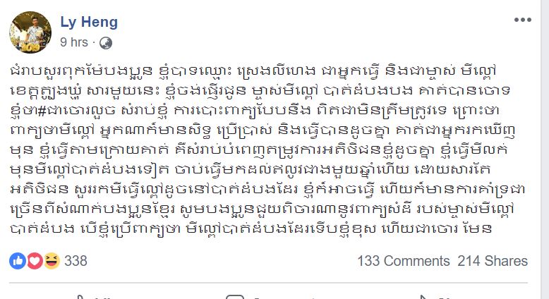 ប្រិយមិត្តបាដឹងរួចហើយអំពីម្ចាស់មីល្ពៅបាត់ដំបងដែលដែរសរសេរសំនេររបស់ខ្លួនថា “មីល្ពៅខ្មែរគឺ ត្រូវបានទទួលស្គាល់ពីប្រជាជនខ្មែរទូទាំងប្រទេសហើយ។ បើជនណាម្នាក់ហានធ្វើមីល្ពៅលក់ ជននោះនឹងចាត់ទុកជា ចោរ។” មានមួយទៀតផងដែរ “មីល្ពៅខ្មែរមិនងាយធ្វើស្រួលដូចអ្នកគិតទេ គឺត្រូវប្រើយុទ្ធសាស្រ្ត មកពី ៩ប្រទេសបញ្ចូលគ្នា ទើបអាចផលិតបានជាមីល្ពៅខ្មែរបាន ចំណែកឯកាផលិតវិញគឺពិបាកដូចដោះស្រាយលំហាត់គណិតចឹង។”ក្រោយមកម្ចាស់មីល្ពៅត្បូងឃ្មុំបានតបទៅវិញថា ស្រេង​ ​លី​ហេង ម្ចាស់មីល្ពៅ ខេត្តត្បូងឃ្មុំ ឃើញសារបែបនេះ លោកក៍បានឆ្លើយតបទៅនឹងលោក គឹម វ៉ាង ម្ចាស់មីល្ពៅខ្មែរ បាត់ដំបង វិញថា «ជំរាបសួរពុកម៉ែបងប្អូន ខ្ញុំបាទឈ្មោះ ស្រេងលីហេង ជាអ្នកធ្វើ និងជាម្ចាស់ មីល្ពៅ ខេត្តត្បូងឃ្មុំ សារមួយនេះ ខ្ញុំចង់ផ្ញើរជូន ម្ចាស់មីល្ពៅ បាត់ដំបងបង គាត់បានចោទខ្ញុំថា#ជាចោរលួច សំរាប់ខ្ញុំ ការបោះពាក្យបែបនឹង ពិតជាមិនត្រឹមត្រូវទេ ព្រោះថាពាក្យថាមីល្ពៅ អ្នកណាក៏មានសិទ្ធ ប្រើប្រាស់ និងធ្វើបានដូចគ្នា គាត់ជាអ្នករកឃើញមុន ខ្ញុំធ្វើតាមក្រោយគាត់ គឺសំរាប់បំពេញតម្រូវការអតិថិជនខ្ញុំដូចគ្នា ខ្ញុំធ្វើមីលក់មុនមីល្ពៅបាត់ដំបងទៀត ចាប់ធ្វើមកដល់ឥលូវជាងមួយឆ្នាំហើយ ដោយសារតែអតិថិជនសួររកមីធ្វើល្ពៅដូចនៅបាត់ដំបងដែរ ខ្ញុំក៏អាចធ្វើ ហើយក៏មានការគាំទ្រជាច្រើនពីសំណាក់បងប្អូនខ្មែរ សូមបងប្អូនជួយពិចារណានូវពាក្យសំដី របស់ម្ចាស់មីល្ពៅបាត់ដំបង បើខ្ញុំប្រើពាក្យថា មីល្ពៅបាត់ដំបងដែរទើបខ្ញុំខុស ហើយជាចោរ មែន»៕