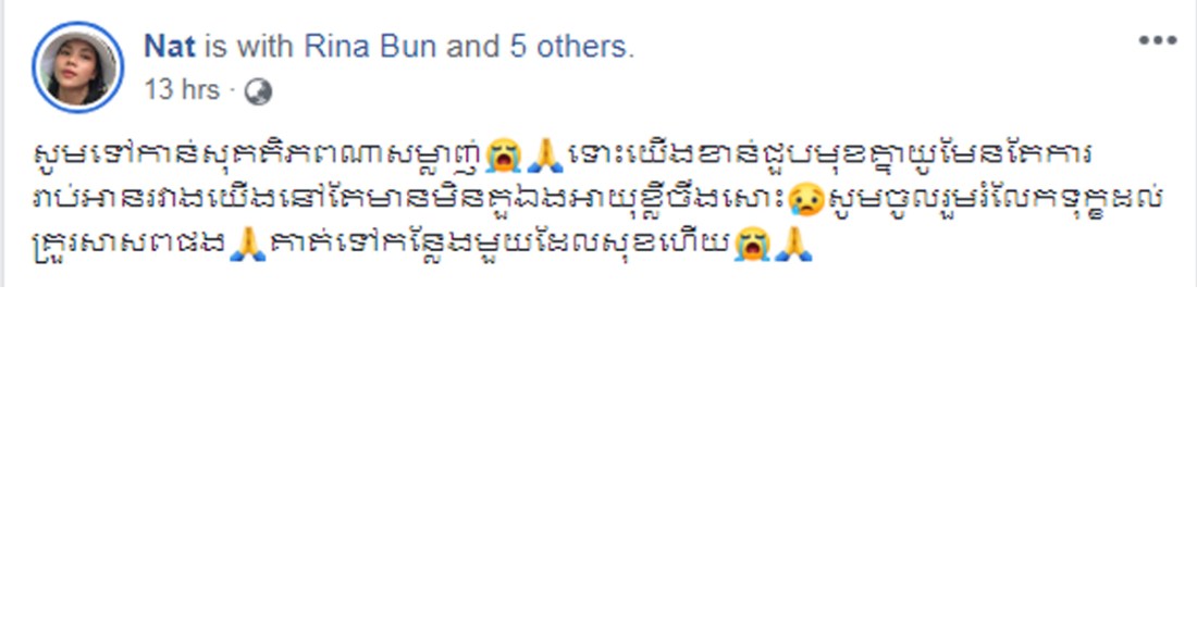ក្រោយពីទទួលដំណឹង ថាមិត្តភិក្តជាទីស្រលាញ់ទៅ ក៏មានបងប្អូនជាច្រើន បានបង្ហោះសារចូលរួមរំលែកទុក្ខ យ៉ាងក្រៀមក្រំ មិនគួរណានៅវ័យក្មេងសោះ តែត្រូវមកស្លាប់ទាំងបែបនេះ។ជាក់ស្តែងនៅក្នុងគណនីហ្វេសប៊ុកមួយដែលមានឈ្មោះថា Nat បានបង្ហោះសារថា “សូមទៅកាន់សុគតិភពណាសម្លាញ់😭🙏ទោះយើងខាន់ជួបមុខគ្នាយូមែនតែការរាប់អានរវាងយើងនៅតែមានមិនគួឯងអាយុខ្លីចឹងសោះ😢សូមចូលរួមរំលែកទុក្ខដល់គ្រួរសាសពផង🙏គាត់ទៅកន្លែងមួយដែលសុខហើយ😭🙏”។ម្ចាស់គណនីហ្វេសប៊ុកឈ្មោះថា គល់ ឈើ ថា “បើកភ្នែក​មកសំម្លាញ់ក្រោកឡើងគ្រប់គ្នាមិនចង់ឃើញឯងដេកបែបនេះរហូតទេ🙏🙏 កុំទៅអីណាដឹងខ្លួនមោ”។