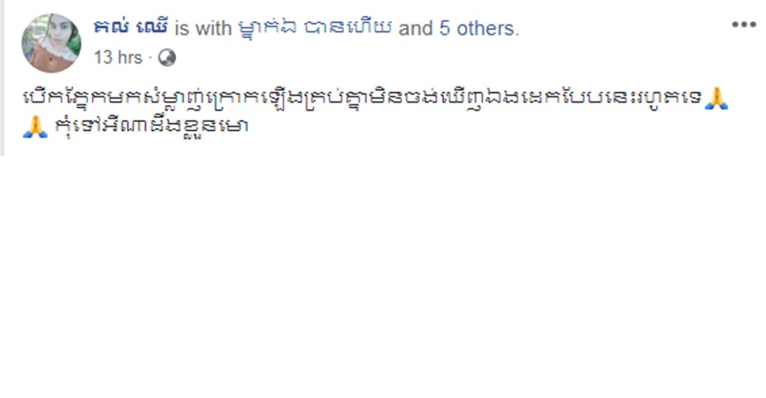 ចំណែក ម្ចាស់គណនីហ្វេសប៊ុក សួង ភក្ដី បានរៀបរាប់ថា​ “ព្រះនាងបងអូនមិនអីអូនត្រូវតែសូៗណាអូនចាំអត់ថាយើងសន្យាអីមួយគ្នាខ្លះអូនត្រូវតែសូឡឿងយើងមកធ្វើរឿងដែលយើងសន្យាមួយគ្នាអូនត្រូវតែមកធ្វើពីនាក់បងមានរឿងច្រើនណាស់ដែលយើងត្រូវធ្វើពីនាក់បងមិនអាចធ្វើម្នាក់ឯងបានទេអូនត្រូវតែមកធ្វើមួយបងដឹងអត់តុក ត្កា”។គួរបញ្ជាក់ផងដែរថា សង្ឃឹមថានាងនិងរស់ តែអីលូវនាងស្លាប់បាត់ទៅហើយសង្ខាមនុស្សអីម្ដេចឡើយមិនទៀងទាត់បែបនេះទៅវិញ😭😭ពិតជាគួរអោយសោកស្ដាយខ្លាំងណាស់់ មនុស្សស្រស់់សោភា យ៉ាងនេះ មិនគួរណាអាយុខ្លីបែបនេះសោះ!ក្រុមគ្រួសារនាងមិនដឹងជា កើតទុក្ខ ប៉ុណ្ណានោះទេ? 😓😓😓😓