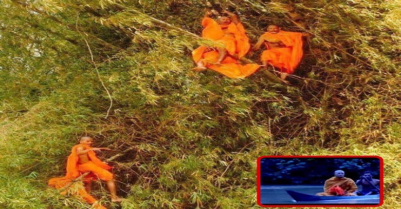 ព្រះអង្គក៏ព្រមព្រៀងនិមន្តទៅផ្ទះបុណ្យ, ហើយគ្រប់អង្គក៏ឡើងលើផ្ទះនោះ សូត្រធម៌ធម្មតា, មនុស្សទាំងនោះអង្គុយស្តាប់លោកសូត្រធម៌ ហើយបុរសចាស់ជាងគេនោះបានប្រាប់លោកថា កុំអោយសូត្រធម៌ករណីយមត្ថកុសលេន… (ធម៌សម្រាប់សូត្រដេញខ្មោច) អោយសោះ ប៉ុន្តែព្រះសង្ឃគ្រប់អង្គក៏មានការសង្ស័យ ហើយក៏ចាប់ផ្តើមសូត្រស្រាប់តែបាត់មនុស្សអស់រលីង ហើយព្រះសង្ឃទាំង៣អង្គស្រាប់តែជាប់នៅលើចុងឬស្សីទាំងបីអង្គ ហើយអ្នកស្រុុកក៏មានការងឿងឆ្ងល់ ក៏នាំអ្នកភូមិទៅជួយលោក លោកបានប្រាប់ថា អាត្មាមកសូត្រមន្តគេនៅភូមិនេះឯង អ្នកស្រុកក៏ប្រាប់តបទៅវិញថា ទីនេះគ្មានភូមិទេ មានតែកន្លែងកប់ខ្មោច ។