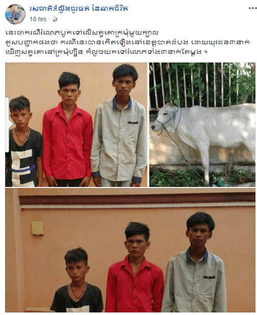 ករណីលួចសត្វគោយករំលោភនេះ ត្រូវកម្លាំងឃាត់ខ្លួនបានបន្ទាប់បានទទួលព័ត៌មានជាក់ស្តែងក្នុងការស៊ើបអង្កេតយ៉ាងក្តៅគគុក នៅចំណុចភូមិជ្រៃ១ ឃុំជ្រៃ ស្រុកមោងឫស្សី ខេត្តបាត់ដំបង បានធ្វើការបង្ក្រាបចោរលួចគោបានចំនួន៣នាក់ ៖