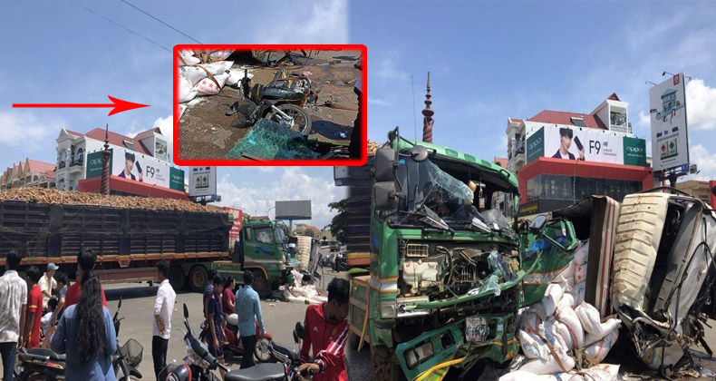 ឡានដឹកអង្ករចុះពីលើស្ពានគីហ្សូណាដាច់ហ្វ្រាំង បានទៅឡានដឹកដំឡូង ឡានតាកូម៉ា និងម៉ូតូ១គ្រឿង បណ្តាលឲ្យ…(មានវិដេអូ)