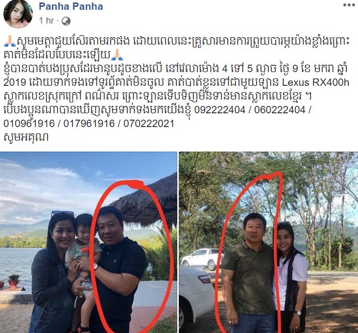 នេះជាការបញ្ជាក់របស់គណនីឈ្មោះ Panha Panha ដែលត្រូវជាប្អូនស្រីរបស់បុរសដែលបាត់ខ្លួន «សូមជួយស៊ែរផងបងប្អូន​ ខ្ញុំបានបាត់បងប្រុសដែរមានូបដូចខាងលើ នៅវេលាម៉ោង 4 ទៅ 5 ល្ងាច ថ្ងៃ 9 ខែ មករា ឆ្នាំ 2019 ដោយទាក់ទងទៅទូរព្ទ័គាត់មិនចូល គាត់បាត់ខ្លួនទៅជាមួយឡាន Lexus RX400h ស្លាកលេខស្រុកក្រៅ ពណ៌ស ព្រោះឡានទើបទិញមិនទាន់មានស្លាកលេខខ្មែរ ។ បើបងប្អូនណាបានឃើញសូមទាក់ទងមកយើងខ្ញុំ 092222404 / 060222404 / 010961916 / 017961916​ សូមអគុណ»។