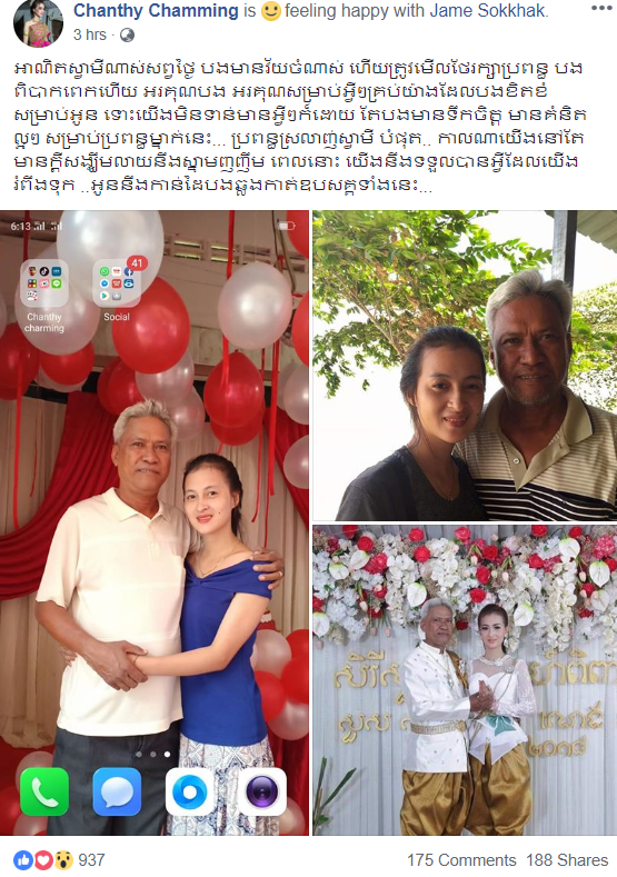 គ្រាន់តែឆ្លងឆ្នាំចាស់ចូលឆ្នាំថ្មីភ្លាម បងស្រីដែលមានឈ្មោះខាងលើ បង្ហោះសារ ពីទុកលំបាករបស់ប្ដី សេចក្ដីស្រលាញ់ និងសុភមង្គលក្នុងគ្រួសារដែលប្ដីចាស់ផ្ដល់ឲ្យយ៉ាងផ្អែមល្ហែមថា៖