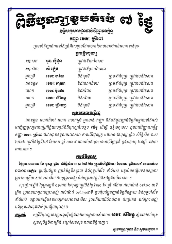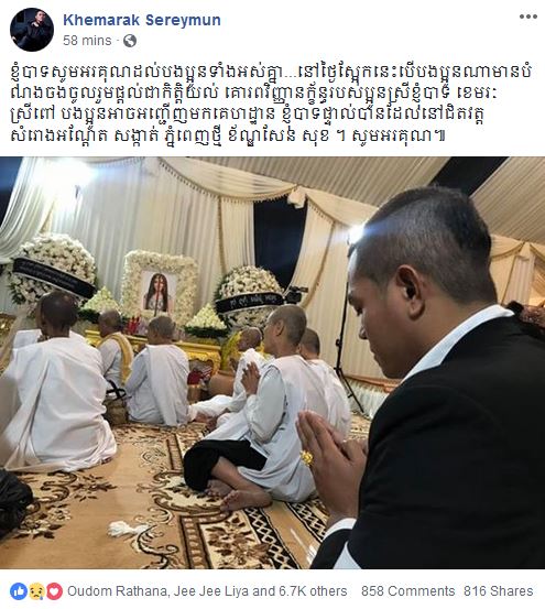«ខ្ញុំបាទ សូមអរគុណដល់ បងប្អូនទាំងអស់គ្នា…នៅថ្ងៃស្អែកនេះ បើបងប្អូនណា មានបំណងចង់ចូលរួម​ ផ្តល់ជាកិត្តិយល់ គោរពវិញ្ញានក្ខ័ន្ធ​ របស់ប្អូនស្រីខ្ញុំបាទ ខេមរៈ ស្រីពៅ បងប្អូនអាចអញ្ជើញ​ មកគេហដ្ឋាន ខ្ញុំបាទផ្ទាល់បាន​ ដែលនៅជិតវត្ត សំរោងអណ្តែត សង្កាត់ ភ្នំពេញថ្មី ខ័ណ្ឌសែន សុខ ។ សូមអរគុណ»។