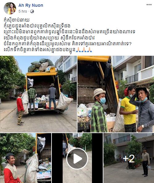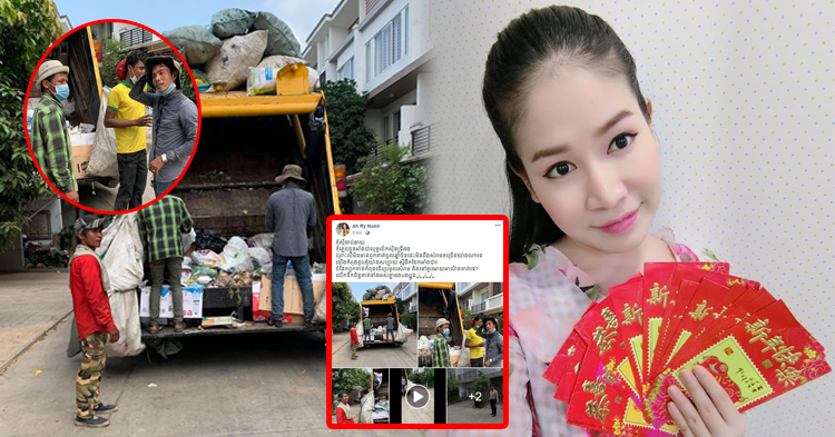 ដោយបងស្រី​ បាន​ចែក​ផ្លែ​ឈើ​ និងអាំង​ប៉ាវ​មួយចំនួន ជូនទៅដល់​សន្តិសុខ​ និង​អ្នកប្រមូល​សំរាម​តាមផ្លូវ​ និងតាមផ្ទះដែលមាន​គ្នា​ប្រមាណ​ជា​ បួន​ ប្រាំ​នាក់​ ។ ដែលនេះ​ពិតជា​រឿងមួយដ៏ល្អបំផុត​ ដែលក្នុងនាម​យេីង​ជាខ្មែរ​ដូចគ្នា​ ចេះជួយ​គ្នា​ទៅ​វិញ​ទៅមក​បែបនេះ​ ។ ក្នុងនោះ​ដែរ​ អ្នក​នាង​ ស្រី​ អូន​ ក៏មាន​ពាក្យ​ផ្តាំផ្ញើទៅ​កាន់​មហាជន​ដែរថា៖«កុំសុីចាប់ឆាយ​ កុំភ្លេចជូនអាំងប៉ាវ​ បុគ្គលិកសុីនទ្រីផង ព្រោះបេីមិនមានពួកគាត់​ ចូលឆ្នាំចិននេះ​ មិនដឹងសំរាមគច្រេីនយ៉ាងណាទេ។ យេីងកំពុងជួបជុំ​ យ៉ាងសប្បាយ សុីផឹកចែកអាំងប៉ាវ​ ចំនែកពួកគាត់​ កំពុងដេីរប្រមូលសំរាម គិតទៅគួរអោយអាណិតគាត់ទេ?​ លេីកទឹកចិត្តគាត់ទាំងអស់គ្នាផងបងប្អូន»។