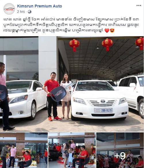 ដោយលែកចំពោះការ៉ាស់ លក់រថយន្តទំនើបៗ Kimsrun Premium Auto បានធ្វើអោយមហាជនជាច្រើនមានការភ្ញាក់ផ្អើលយ៉ាងខ្លាំង ដោយបានចែកអាំងប៉ាវ អោយបុគ្គលិក សុទ្ធតែ ចិញ្ចៀន​មាស​ ខ្សែកមាស​ ប្រាក់ខែ​ទី​ ១៣​ បូកថែមប្រាក់លេីកទឹកចិត្តលេីបុគ្គលិក​។ ដោយនេះគឺជាអាំងប៉ាវ ដែលមានតម្លៃយ៉ាងខ្លាំង ដែលក្រុមហ៊ុនផ្សេងៗ មិនសូវមានអ្នកធ្វើតាម។យោងតាមផេកហ្វេសបុក Kimsrun Premium Auto បានបង្ហោះថា «ហេង​ ហេង​ ឆ្នាំថ្មី​ ចែក​ អាំង​ប៉ាវ​ មានទាំង​ ចិញ្ចៀន​មាស​ ខ្សែកមាស​ ប្រាក់ខែ​ទី​ ១៣​ បូកថែមប្រាក់លេីកទឹកចិត្តលេីបុគ្គលិក​ យកបេះដូងមកធ្វេីការ​ ជាពិសេសេ​ ផ្តល់នូវរថយន្តម្នាក់មួយគ្រឿង​ ជូនបុគ្គលិកឆ្នេីម​ បម្រេីការងារយូរឆ្នាំ»៕